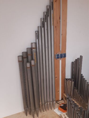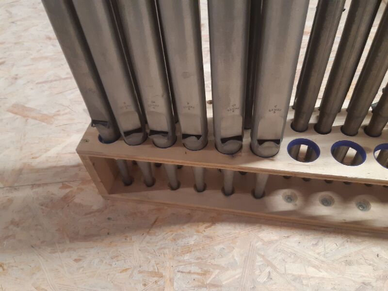 Komplettes Register Gamba 8' von C-g3 in Zinn/Blei Legierungzu verkaufen. C-F gedeckt, Fis bis g3 offen. Einige Stimmrollen müssen neu eingelötet werden.