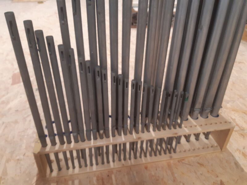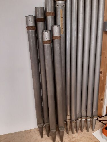 Komplettes Register Gamba 8' von C-g3 in Zinn/Blei Legierungzu verkaufen. C-F gedeckt, Fis bis g3 offen. Einige Stimmrollen müssen neu eingelötet werden.